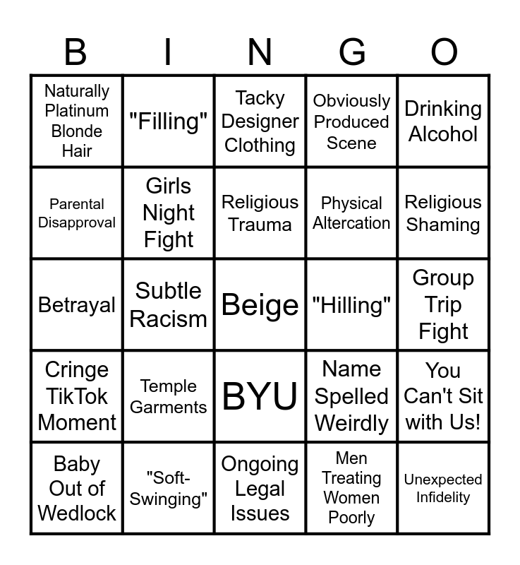This bingo card has a free space and 24 words: Temple Garments, "Soft-Swinging", Religious Trauma, Baby Out of Wedlock, Drinking Alcohol, Naturally Platinum Blonde Hair, Parental Disapproval, "Filling", "Hilling", BYU, Physical Altercation, Betrayal, Name Spelled Weirdly, You Can't Sit with Us!, Girls Night Fight, Men Treating Women Poorly, Group Trip Fight, Tacky Designer Clothing, Religious Shaming, Subtle Racism, Unexpected Infidelity, Cringe TikTok Moment, Obviously Produced Scene and Ongoing Legal Issues.
