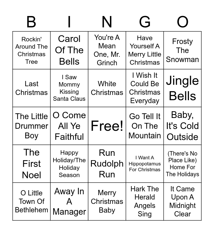 This bingo card has a free space and 79 words: All I Want For Christmas Is You, Feliz Navidad, You're A Mean One, Mr. Grinch, Merry Christmas, Darling, Mary, Did You Know?, Happy Christmas (War Is Over), Sleigh Ride, Silver Bells, It's Beginning To Look A Lot Like Christmas, The Chipmunks Song - Christmas Don't Be Late, Santa Claus Is Comin' To Town, Do You Hear What I Hear, Have Yourself A Merry Little Christmas, Rockin' Around The Christmas Tree, Let It Snow, Last Christmas, O Tannenbaum, Happy Holiday/The Holiday Season, Mele Kalikimaka, Baby, It's Cold Outside, Silent Night, Frosty The Snowman, The Little Drummer Boy, White Christmas, I Saw Mommy Kissing Santa Claus, The Christmas Song, Here We Come A-Caroling/We Wish You A Merry Christmas, Hard Candy Christmas, Holly Jolly Christmas, Santa Baby, Jingle Bells, Little Saint Nick, Merry Christmas Baby, Rudolph The Red-Nosed Reindeer, O Little Town Of Bethlehem, Go Tell It On The Mountain, Angels We Have Heard On High, Joy To The World, 12 Days Of Christmas, It Came Upon A Midnight Clear, Jingle Bell Rock, What Christmas Means To Me, Christmas (Baby Please Come Home), God Rest Ye Merry Gentlemen, The Sounds Of Christmas, Carol Of The Bells, O Christmas Tree, Pretty Paper, I'll Be Home For Christmas, Winter Wonderland, (There's No Place Like) Home For The Holidays, O Come All Ye Faithful, I Want A Hippopotamus For Christmas, All I Want For Christmas Is My Two Front Teeth, It's The Most Wonderful Time Of The Year, Santa's Beard, Blue Christmas, Merry Xmas Everybody, Do They Know It's Christmas, Run Rudolph Run, I Wish It Could Be Christmas Everyday, Someday At Christmas, O Holy Night, Grandma Got Run Over By A Reindeer, A Marshmallow World, Santa's Got An Airplane, You Make It Feel Like Christmas, We Three Kings, O Come, O Come, Emmanuel, The First Noel, Away In A Manager, Up On The Housetop, What Child is This?, Ding Dong Merrily on High, Coventry Carol, Hark The Herald Angels Sing, Sussex Carol, Deck The Halls and Good Christian Men Rejoice.