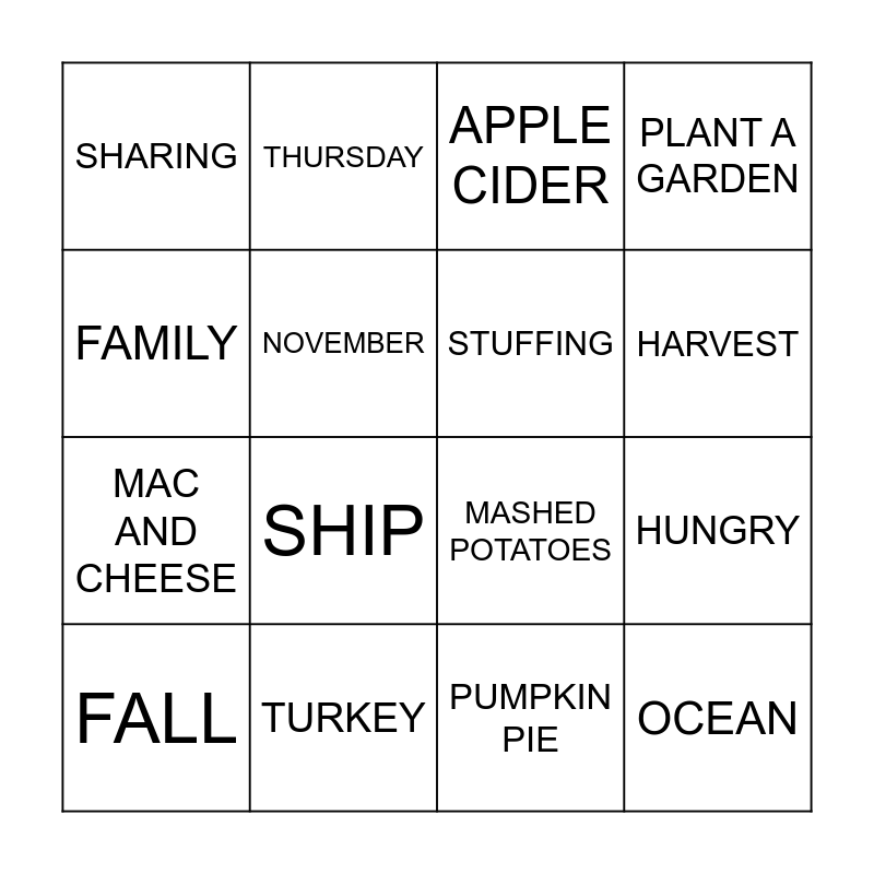 This bingo card has 24 words: NATIVE AMERICANS, PILGRIMS, HARVEST, FRIENDS, FAMILY, SHARING, NOVEMBER, THURSDAY, TURKEY, CORN, MAC AND CHEESE, MASHED POTATOES, ROLLS, SALAD, STUFFING, CRANBERRY SAUCE, PUMPKIN PIE, APPLE CIDER, SHIP, HUNGRY, FALL, OCEAN, PLANT A GARDEN and THANKSGIVING.