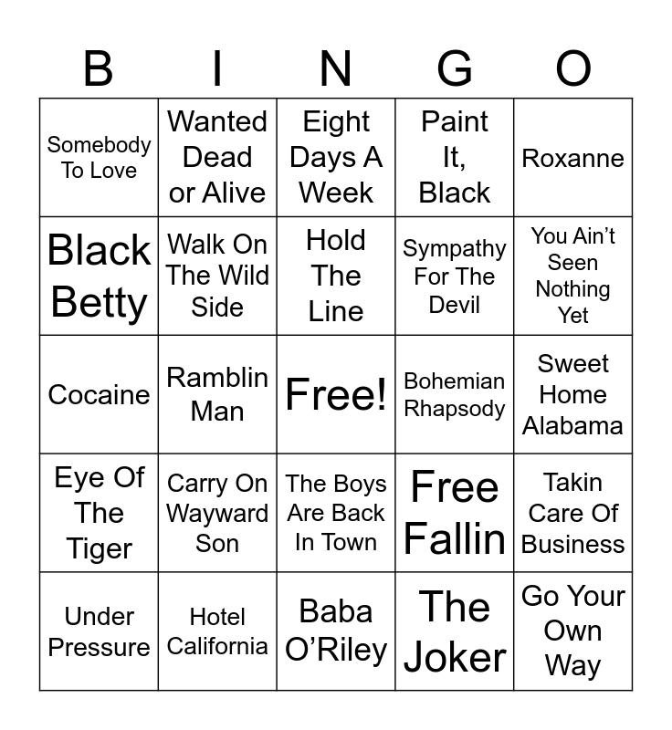 This bingo card has a free space and 29 words: Under Pressure, You Can’t Always Get What You Want, Ramblin Man, Hey Jude, Somebody To Love, Eight Days A Week, Walk On The Wild Side, Carry On Wayward Son, Bohemian Rhapsody, Hotel California, Sweet Home Alabama, Go Your Own Way, Baba O’Riley, The Joker, You Ain’t Seen Nothing Yet, Any Way You Want It, The Boys Are Back In Town, Eye Of The Tiger, Roxanne, Cocaine, Free Fallin, Walk This Way, Sympathy For The Devil, Black Betty, Paint It, Black, Wanted Dead or Alive, Takin Care Of Business, Hold The Line and Free Bird.