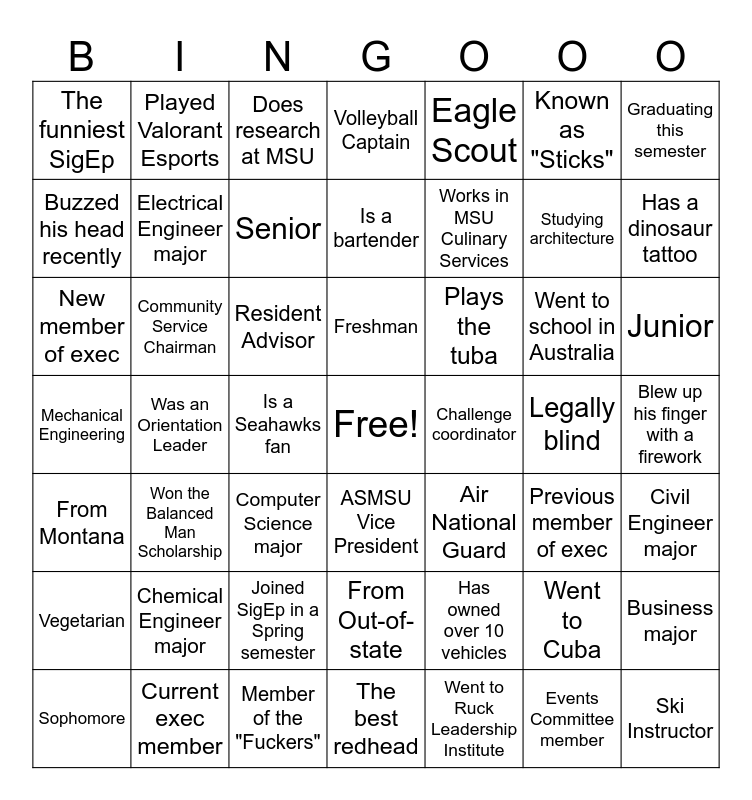 This bingo card has a free space and 48 words: Has owned over 10 vehicles, Studying architecture, The best redhead, Was an Orientation Leader, Resident Advisor, Blew up his finger with a firework, Played Valorant Esports, Current exec member, Known as "Sticks", ASMSU Vice President, Graduating this semester, Volleyball Captain, Went to school in Australia, Plays the tuba, Vegetarian, Legally blind, Buzzed his head recently, Has a dinosaur tattoo, Went to Cuba, Eagle Scout, Works in MSU Culinary Services, Is a Seahawks fan, The funniest SigEp, Electrical Engineer major, Business major, Senior, Junior, Sophomore, Freshman, Community Service Chairman, Events Committee member, Challenge coordinator, Civil Engineer major, Chemical Engineer major, Mechanical Engineering, Air National Guard, Previous member of exec, New member of exec, Computer Science major, Joined SigEp in a Spring semester, From Montana, Ski Instructor, Does research at MSU, Member of the "Fuckers", Is a bartender, From Out-of-state, Won the Balanced Man Scholarship and Went to Ruck Leadership Institute.