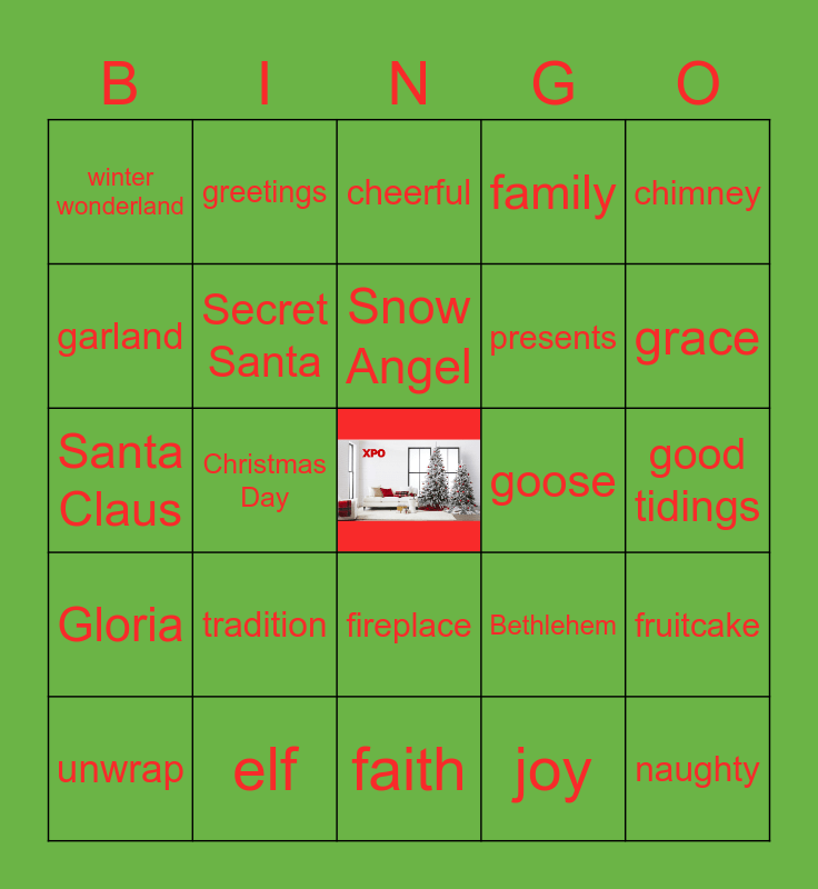 This bingo card has a free space and 96 words: angel, baking, bells, Bethlehem, blessing, Blitzen, candle, candy cane, card, caring, caroling, celebrate, chilly, chimney, Christmas Eve, Christmas Day, cheerful, church, cookies, cranberries, Dancer, Christmas tree, decorations, Donner, eggnog, elf, December, family, Feliz Navidad, festive, figgy pudding, faith, Frosty, fruitcake, garland, gift, fireplace, gingerbread house, good tidings, Gloria, gold, gingerbread, goose, grace, green, greetings, goodwill, holiday, holly, hot chocolate, hymn, Grinch, Jack Frost, Jerusalem, Jesus, jingle bells, ice skating, joy, kings, Krampus, lights, jolly, Mary, Merry Christmas, miracle, mistletoe, list, music, naughty, nice, Noel, mittens, nutcracker, opening presents, ornaments, partridge, North Pole, presents, Rudolph, Santa Claus, Secret Santa, Prancer, Three Kings Day, tidings, toys, tradition, Snow Angel, turkey, trimming, unwrap, Vixen, tree, wrapping, wreath, winter wonderland and winter.