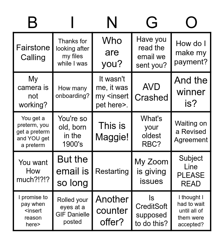 This bingo card has a free space and 24 words: But the email is so long, Rolled your eyes at a GIF Danielle posted, It wasn't me, it was my <insert pet here>., I promise to pay when <insert reason here>, How do I make my payment?, Fairstone Calling, My camera is not working?, Thanks for looking after my files while I was, What's your oldest RBC?, Restarting, AVD Crashed, You get a preterm, you get a preterm and YOU get a preterm, My Zoom is giving issues, Subject Line PLEASE READ, How many onboarding?, Is CreditSoft supposed to do this?, Waiting on a Revised Agreement, Who are you?, And the winner is?, You're so old, born in the 1900's, I thought I had to wait until all of them were accepted?, You want How much?!?!?, Have you read the email we sent you? and Another counter offer?.