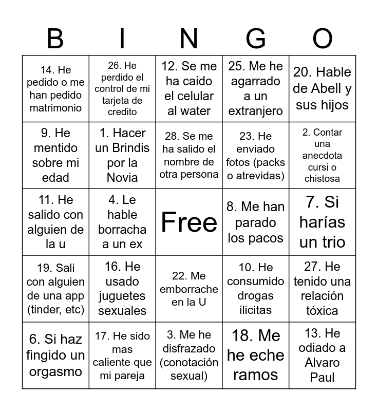 This bingo card has a free space and 29 words: 6. Si haz fingido un orgasmo, 15. He vomitado de borracha o caña, 4. Le hable borracha a un ex, 24. Hice trampa en una prueba o examen, 14. He pedido o me han pedido matrimonio, 12. Se me ha caido el celular al water, 1. Hacer un Brindis por la Novia, 16. He usado juguetes sexuales, 8. Me han parado los pacos, 17. He sido mas caliente que mi pareja, 7. Si harías un trio, 13. He odiado a Alvaro Paul, 3. Me he disfrazado (conotación sexual), 18. Me he eche ramos, 2. Contar una anecdota cursi o chistosa, 21. He visto porno, 22. Me emborrache en la U, 19. Sali con alguien de una app (tinder, etc), 20. Hable de Abell y sus hijos, 11. He salido con alguien de la u, 10. He consumido drogas ilicitas, 5. Di algo que la isi diria, 23. He enviado fotos (packs o atrevidas), 9. He mentido sobre mi edad, 25. Me he agarrado a un extranjero, 26. He perdido el control de mi tarjeta de credito, 27. He tenido una relación tóxica, 28. Se me ha salido el nombre de otra persona and 29. Se me han perdido o quedado las llaves dentro de la casa.