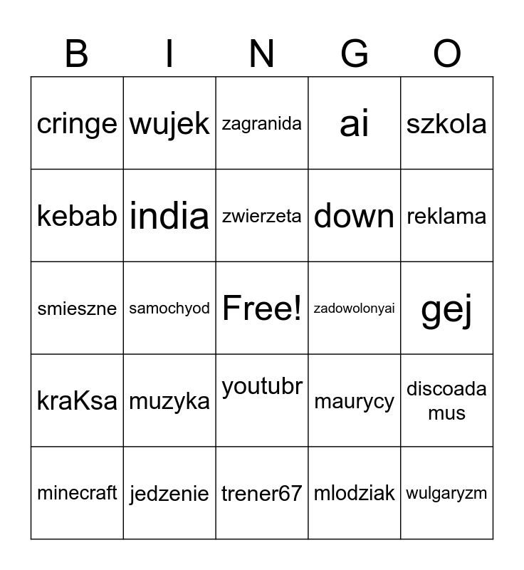 This bingo card has a free space and 24 words: muzyka, jedzenie, zwierzeta, minecraft, szkola, cringe, kebab, wujek, zadowolonyai, youtubr, down, smieszne, maurycy, discoada mus, india, mlodziak, gej, zagranida, reklama, samochyod, wulgaryzm, kraKsa, ai and trener67.