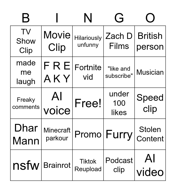 This bingo card has a free space and 24 words: Minecraft parkour, Brainrot, Fortnite vid, nsfw, British person, TV Show Clip, made me laugh, Movie Clip, under 100 likes, Promo, "like and subscribe", Freaky comments, Furry, Stolen Content, F R E A K Y, Podcast clip, Speed clip, Hilariously unfunny, Musician, AI voice, AI video, Dhar Mann, Zach D Films and Tiktok Reupload.