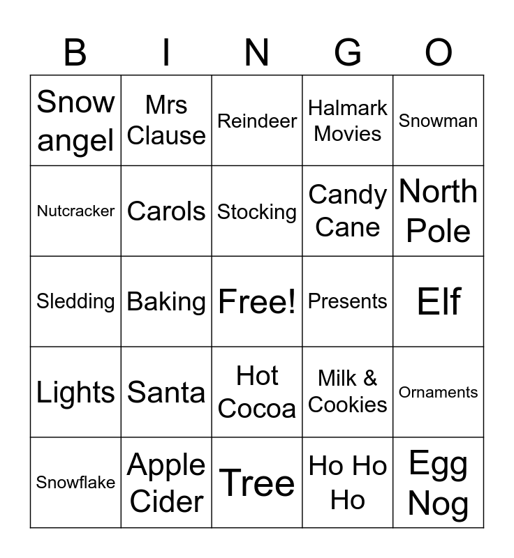 This bingo card has a free space and 25 words: Santa, Tree, Stocking, Snowflake, Snowman, Snow angel, Nutcracker, Mrs Clause, Presents, Hot Cocoa, Candy Cane, Sledding, Milk & Cookies, Ornaments, Carols, Santa Hat, Elf, Reindeer, North Pole, Baking, Egg Nog, Apple Cider, Lights, Halmark Movies and Ho Ho Ho.