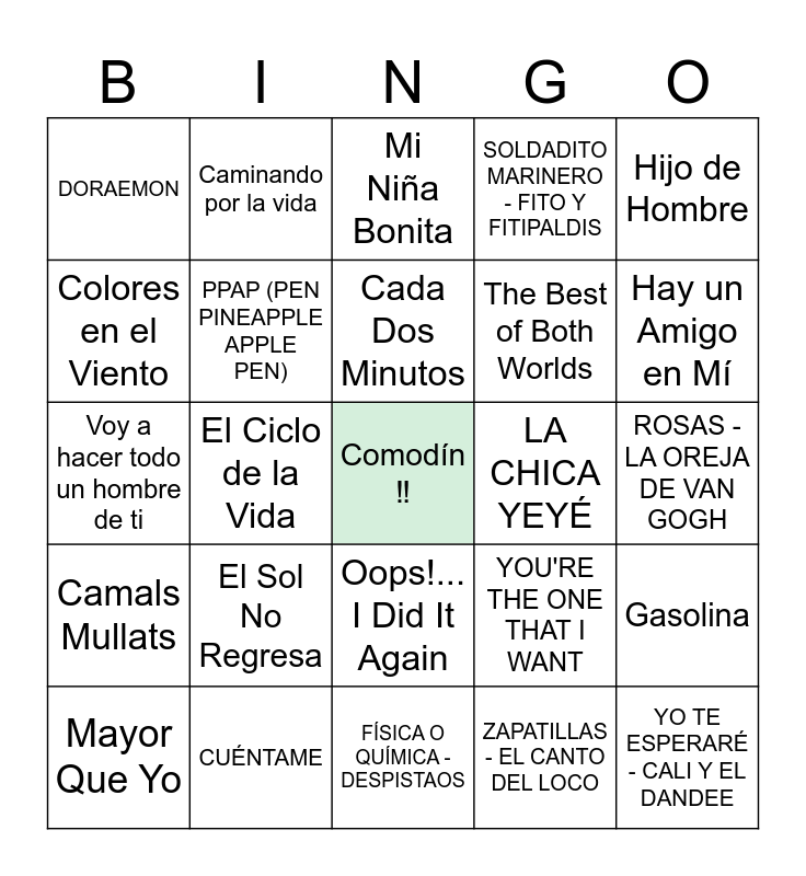 This bingo card has a free space and 44 words: Breaking Free, El Sol No Regresa, MÚSIC DE CARRER - TXARANGO, ZAPATILLAS - EL CANTO DEL LOCO, CUANDO TÚ VAS - CHENOA, WAKA WAKA - SHAKIRA, PPAP (PEN PINEAPPLE APPLE PEN), MAMMA MIA - ABBA, SOLDADITO MARINERO - FITO Y FITIPALDIS, YO TE ESPERARÉ - CALI Y EL DANDEE, DORAEMON, CUÉNTAME, YOU'RE THE ONE THAT I WANT, ROSAS - LA OREJA DE VAN GOGH, FLYING FREE - PONT AERI, TOBOGAN - ZOO, FÍSICA O QUÍMICA - DESPISTAOS, LA CHICA YEYÉ, This Is Me, Voy a hacer todo un hombre de ti, Caminando por la vida, Oops!... I Did It Again, Carolina, Hijo de Hombre, Antes de que Cuente Diez, Corazón de Mimbre, Cada Dos Minutos, Zumba, Gasolina, Mayor Que Yo, Atrevete te te, Mi Niña Bonita, La Fúmiga - Mediterrània, Zoo - L'Estiu, Camals Mullats, Taboo, Travesuras, Noche de Sexo, Hay un Amigo en Mí, Colores en el Viento, El Ciclo de la Vida, Naturally, The Best of Both Worlds and When You Look Me In The Eyes.