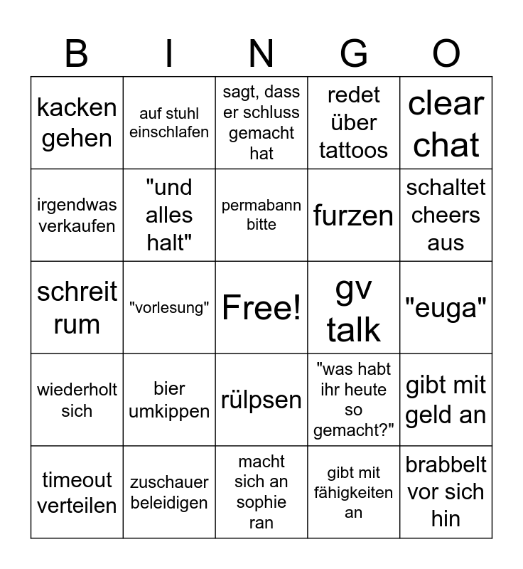 This bingo card has a free space and 24 words: bier umkippen, zuschauer beleidigen, permabann bitte, timeout verteilen, clear chat, kacken gehen, irgendwas verkaufen, auf stuhl einschlafen, gv talk, rülpsen, furzen, schreit rum, "was habt ihr heute so gemacht?", gibt mit geld an, "und alles halt", gibt mit fähigkeiten an, "euga", sagt, dass er schluss gemacht hat, schaltet cheers aus, "vorlesung", brabbelt vor sich hin, wiederholt sich, redet über tattoos and macht sich an sophie ran.