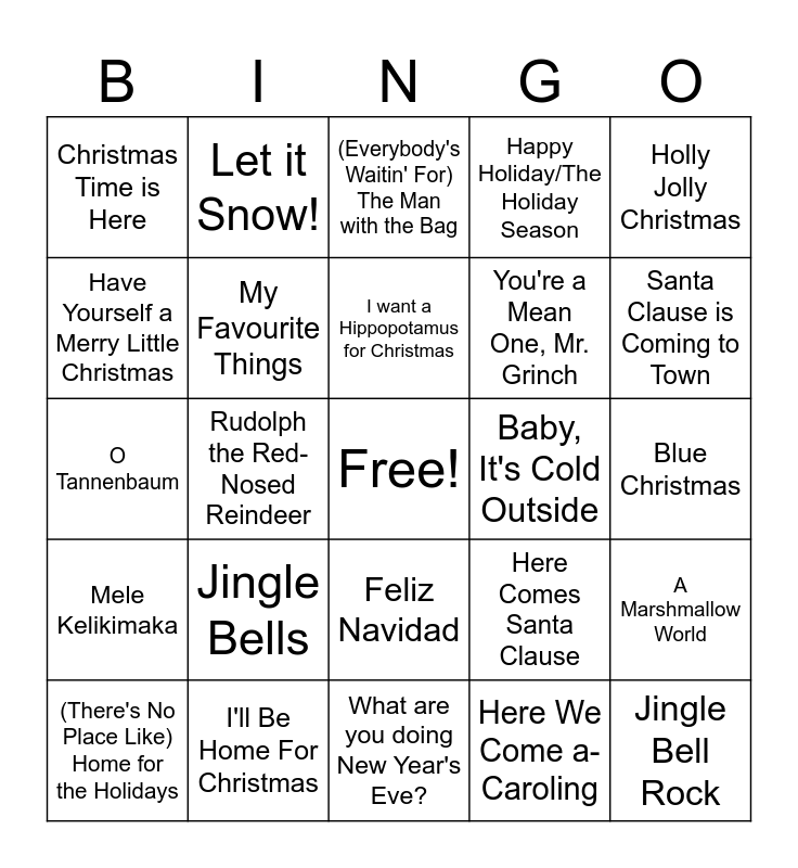 This bingo card has a free space and 68 words: Rockin' Around the Christmas Tree, Jingle Bell Rock, Christmas (Baby Please Come Home), The Christmas Song, Sleigh Ride, It's the Most Wonderful Time of the Year, Let it Snow!, Run Rudolph Run, I want a Hippopotamus for Christmas, White Christmas, Feliz Navidad, Santa Baby, Blue Christmas, Holly Jolly Christmas, It's Beginning to Look a Lot like Christmas, Have Yourself a Merry Little Christmas, Rudolph the Red-Nosed Reindeer, Christmas Time is Here, Little Saint Nick, Jingle Bells, You're a Mean One, Mr. Grinch, Here Comes Santa Clause, Mele Kelikimaka, Winter Wonderland, Please Come Home for Christmas, This Christmas, God Rest Ye Merry Gentlemen, Cool Yule, A Marshmallow World, Deck The Hall, (Everybody's Waitin' For) The Man with the Bag, Frosty the Snowman, Caroling, Caroling, Do you Hear What I Hear?, Happy Holiday/The Holiday Season, Merry Christmas Darling, Silver Bells, (There's No Place Like) Home for the Holidays, Santa Clause is Coming to Town, O Tannenbaum, I've Got My Love to Keep me Warm, O Come All Ye Faithful, My Favourite Things, The First Noel, Little Drummer Boy, Mary's Boy Child, O Little Town of Bethlehem, Linus and Lucy, Baby, It's Cold Outside, I'll Be Home For Christmas, Joy to the World, Mistletoe and Holly, Pretty Paper, What are you doing New Year's Eve?, Silent Night, Adeste Fideles, Here We Come a-Caroling, I saw Mommy Kissing Santa Claus, O Christmas Tree, What Child Is This, All I Want For Christmas (Is My Two Front Teeth), The Christmas Waltz, 'Zat You, Santa Claus?, Twelve Days of Christmas, Hark! The Herald Angels Sing, O Holy Night, The Christmas List and The Nutcracker.