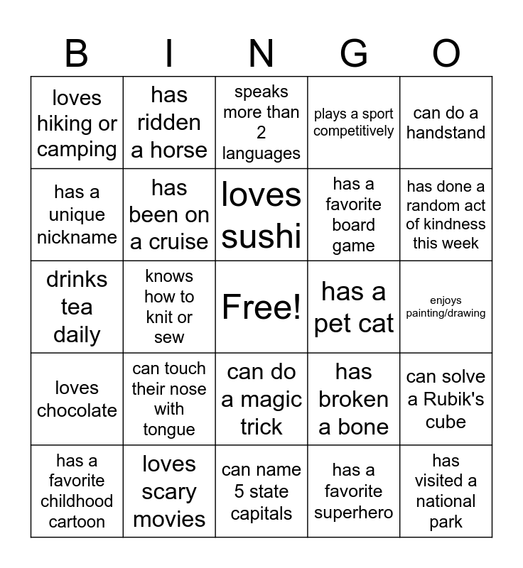 This bingo card has a free space and 24 words: has a favorite childhood cartoon, can touch their nose with tongue, loves sushi, has a favorite superhero, can do a handstand, loves hiking or camping, has ridden a horse, speaks more than 2 languages, has a pet cat, enjoys painting/drawing, drinks tea daily, has been on a cruise, has broken a bone, can solve a Rubik's cube, has a unique nickname, loves scary movies, can name 5 state capitals, plays a sport competitively, has done a random act of kindness this week, loves chocolate, knows how to knit or sew, can do a magic trick, has a favorite board game and has visited a national park.