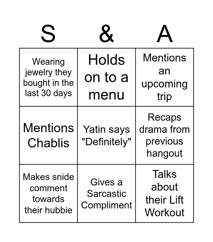 This bingo card has a free space and 12 words: Calls someone out for being late, Seema makes you laugh, Talks about their Lift Workout, Recaps drama from previous hangout, Holds on to a menu, Mentions an upcoming trip, Gives a Sarcastic Compliment, Anita makes you laugh, Wearing jewelry they bought in the last 30 days, Mentions Chablis, Makes snide comment towards their hubbie and Mentions how much or how little they did for this party.