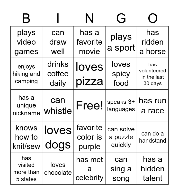 This bingo card has a free space and 24 words: has visited more than 5 states, loves dogs, loves pizza, can sing a song, has ridden a horse, plays video games, can draw well, has a favorite movie, speaks 3+ languages, has run a race, has a unique nickname, drinks coffee daily, can solve a puzzle quickly, can do a handstand, enjoys hiking and camping, loves chocolate, has met a celebrity, plays a sport, has volunteered in the last 30 days, knows how to knit/sew, can whistle, favorite color is purple, loves spicy food and has a hidden talent.