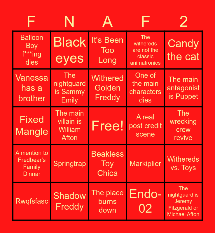 This bingo card has a free space and 24 words: Springtrap, Shadow Freddy, Withered Golden Freddy, Rwqfsfasc, Candy the cat, Balloon Boy f***ing dies, Vanessa has a brother, Black eyes, A real post credit scene, Beakless Toy Chica, One of the main characters dies, Fixed Mangle, Markiplier, Withereds vs. Toys, The nightguard is Sammy Emily, Endo-02, The wrecking crew revive, It's Been Too Long, The main antagonist is Puppet, The main villain is William Afton, The nightguard is Jeremy Fitzgerald or Michael Afton, A mention to Fredbear's Family Dinnar, The withereds are not the classic animatronics and The place burns down.