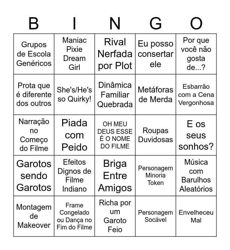 This bingo card has a free space and 24 words: Efeitos Dignos de Filme Indiano, Frame Congelado ou Dança no Fim do Filme, Dinâmica Familiar Quebrada, Montagem de Makeover, Por que você não gosta de...?, Grupos de Escola Genéricos, Prota que é diferente dos outros, Maniac Pixie Dream Girl, Roupas Duvidosas, Briga Entre Amigos, Metáforas de Merda, Narração no Começo do Filme, Personagem Minoria Token, Música com Barulhos Aleatórios, She's/He's so Quirky!, Personagem Socável, E os seus sonhos?, Rival Nerfada por Plot, Esbarrão com a Cena Vergonhosa, Piada com Peido, Envelheceu Mal, Garotos sendo Garotos, Eu posso consertar ele and Richa por um Garoto Feio.