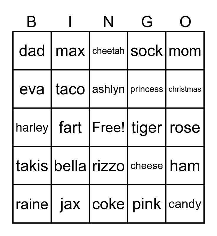 This bingo card has a free space and 24 words: bella, jax, ashlyn, raine, mom, dad, eva, max, tiger, rizzo, princess, harley, cheese, ham, taco, pink, rose, cheetah, christmas, fart, candy, takis, sock and coke.