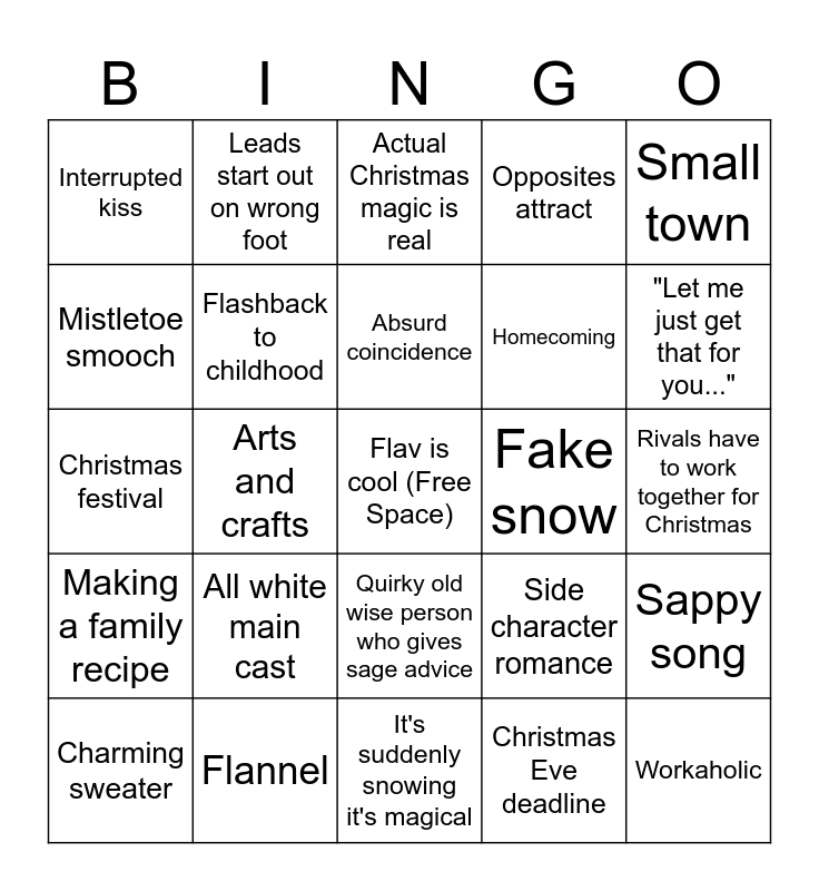 This bingo card has a free space and 34 words: Cynic is filled with Christmas spirit, Christmas Eve deadline, High school sweethearts, Leads only kiss once, Making a family recipe, Flashback to childhood, Small town, Charming sweater, Leads start out on wrong foot, Someone has a Christmas themed name, Absurd coincidence, Actual Christmas magic is real, Mysteriously dead parent, Easily avoided misunderstanding, Fake snow, "Let me just get that for you...", Flannel, Christmas festival, All white main cast, Side character romance, Quirky old wise person who gives sage advice, Money troubles, Interrupted kiss, Rivals have to work together for Christmas, It's suddenly snowing it's magical, Workaholic, Opposites attract, Tree decorating, Homecoming, Mistletoe smooch, A character is vaguely LGBT but it's never shown/confirmed, Arts and crafts, Sappy song and Santa sighting (real or fake).
