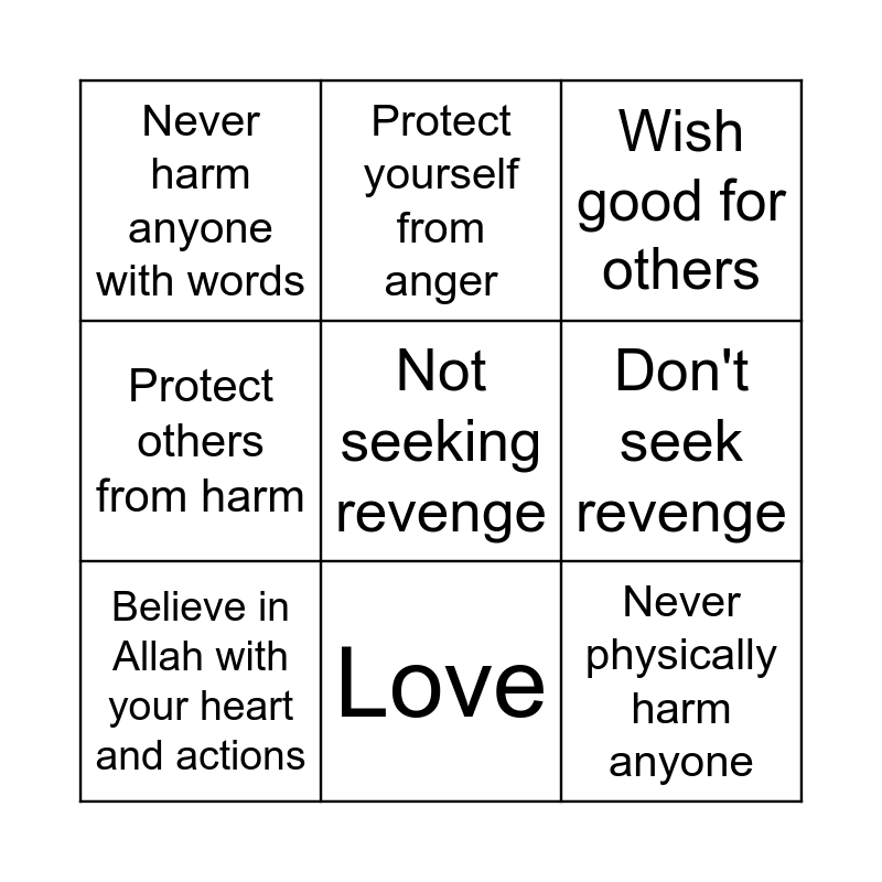 This bingo card has a free space and 10 words: Love, Wish good for others, Never harm anyone with words, Never physically harm anyone, Protect others from harm, Believe in Allah with your heart and actions, Protect yourself from anger, Forgive others, Don't seek revenge and Believe in Allah with your actions.