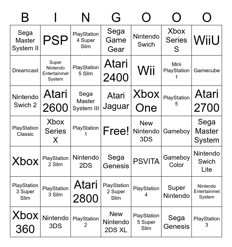 This bingo card has a free space and 48 words: Xbox, Xbox Series X, PlayStation 2, Sega Genesis, Wii, Gameboy, WiiU, Xbox 360, Atari 2600, PlayStation 1, Sega Game Gear, Nintendo Swich, PlayStation 5, Atari 2700, PlayStation Classic, PlayStation 3 Silm, PlayStation 4 Super Slim, Atari Jaguar, PlayStation 4, Xbox Series S, Gamecube, Dreamcast, PSP, PlayStation 5 Silm, PlayStation 5 Super Slim, Mini PlayStation 1, Sega Master System, PlayStation 3 Super Slim, PlayStation 2 Silm, Sega Master System III, PlayStation 2 Super Slim, Xbox One, Super Nintendo, Nintendo Entertainmet System, Sega Master System II, Nintendo 3DS, Nintendo 2DS, New Nintendo 2DS XL, New Nintendo 3DS, Sega Genesis, Nintendo Swich Lite, Nintendo Swich 2, Super Nintendo Entertainmet System, Atari 2800, Atari 2400, PSVITA, Gameboy Color and PlayStation 3.