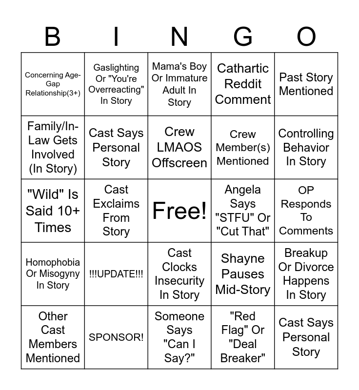 This bingo card has a free space and 24 words: !!!UPDATE!!!, SPONSOR!, Crew LMAOS Offscreen, Other Cast Members Mentioned, Past Story Mentioned, Concerning Age-Gap Relationship(3+), Family/In-Law Gets Involved (In Story), Gaslighting Or "You're Overreacting" In Story, Angela Says "STFU" Or "Cut That", Cast Clocks Insecurity In Story, Crew Member(s) Mentioned, "Wild" Is Said 10+ Times, Shayne Pauses Mid-Story, Breakup Or Divorce Happens In Story, Cast Says Personal Story, "Red Flag" Or "Deal Breaker", OP Responds To Comments, Mama's Boy Or Immature Adult In Story, Controlling Behavior In Story, Cast Exclaims From Story, Cast Says Personal Story, Homophobia Or Misogyny In Story, Cathartic Reddit Comment and Someone Says "Can I Say?".