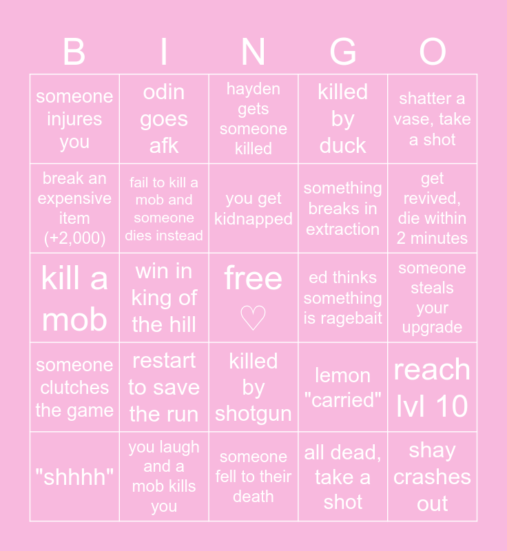 This bingo card has a free space and 24 words: restart to save the run, you laugh and a mob kills you, you get kidnapped, "shhhh", shatter a vase, take a shot, someone injures you, break an expensive item (+2,000), odin goes afk, ed thinks something is ragebait, killed by shotgun, something breaks in extraction, kill a mob, lemon "carried", reach lvl 10, fail to kill a mob and someone dies instead, all dead, take a shot, someone steals your upgrade, hayden gets someone killed, get revived, die within 2 minutes, win in king of the hill, shay crashes out, someone clutches the game, killed by duck and someone fell to their death.