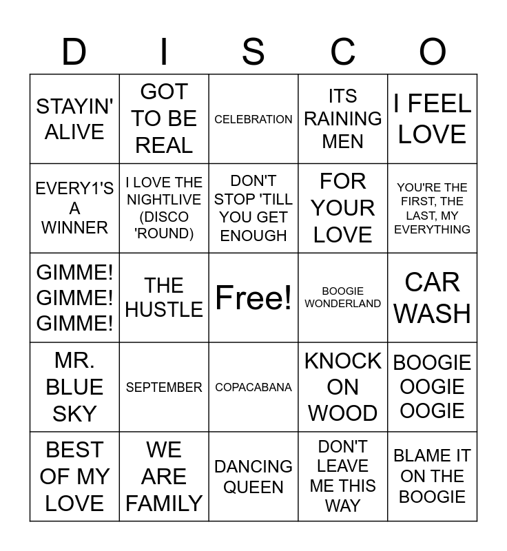 This bingo card has a free space and 24 words: SEPTEMBER, WE ARE FAMILY, DON'T STOP 'TILL YOU GET ENOUGH, BEST OF MY LOVE, I FEEL LOVE, STAYIN' ALIVE, EVERY1'S A WINNER, GOT TO BE REAL, BOOGIE WONDERLAND, COPACABANA, FOR YOUR LOVE, GIMME! GIMME! GIMME!, KNOCK ON WOOD, BOOGIE OOGIE OOGIE, I LOVE THE NIGHTLIVE (DISCO 'ROUND), DON'T LEAVE ME THIS WAY, CAR WASH, CELEBRATION, YOU'RE THE FIRST, THE LAST, MY EVERYTHING, THE HUSTLE, BLAME IT ON THE BOOGIE, MR. BLUE SKY, ITS RAINING MEN and DANCING QUEEN.