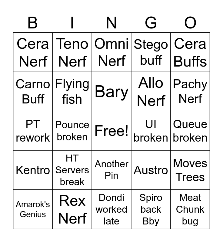 This bingo card has a free space and 24 words: HT Servers break, Rex Nerf, Bary, Amarok's Genius, Cera Buffs, Cera Nerf, Carno Buff, Teno Nerf, UI broken, Another Pin, Allo Nerf, PT rework, Austro, Moves Trees, Flying fish, Spiro back Bby, Queue broken, Omni Nerf, Pachy Nerf, Pounce broken, Meat Chunk bug, Kentro, Stego buff and Dondi worked late.