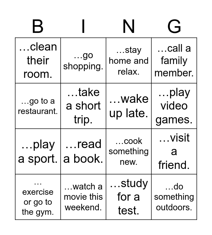 This bingo card has 16 words: …watch a movie this weekend., …visit a friend., …stay home and relax., …clean their room., …play a sport., …go shopping., …cook something new., …study for a test., …go to a restaurant., …take a short trip., …exercise or go to the gym., …call a family member., …read a book., …play video games., …wake up late. and …do something outdoors..