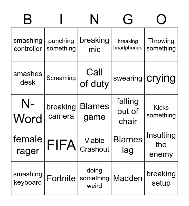 This bingo card has a free space and 24 words: FIFA, Fortnite, Call of duty, smashing keyboard, Throwing something, smashing controller, smashes desk, punching something, falling out of chair, Viable Crashout, swearing, N-Word, Blames lag, Insulting the enemy, Screaming, Madden, Kicks something, breaking mic, crying, breaking camera, breaking setup, female rager, breaking headphones and doing something weird.