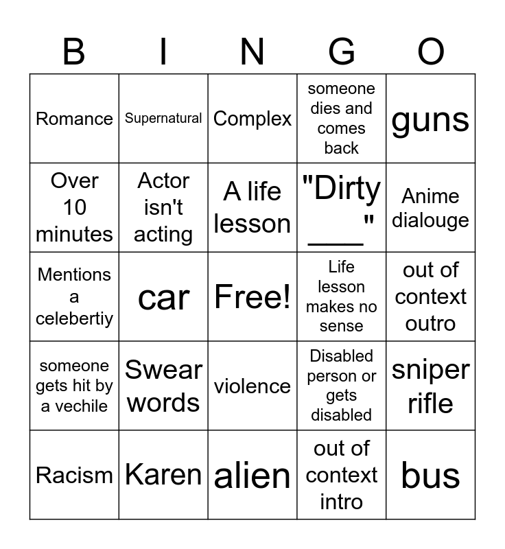 This bingo card has a free space and 24 words: Swear words, Karen, A life lesson, Racism, guns, Romance, Over 10 minutes, Supernatural, Life lesson makes no sense, violence, "Dirty ___", Mentions a celebertiy, Disabled person or gets disabled, sniper rifle, Actor isn't acting, out of context intro, out of context outro, Complex, Anime dialouge, car, bus, someone gets hit by a vechile, someone dies and comes back and alien.