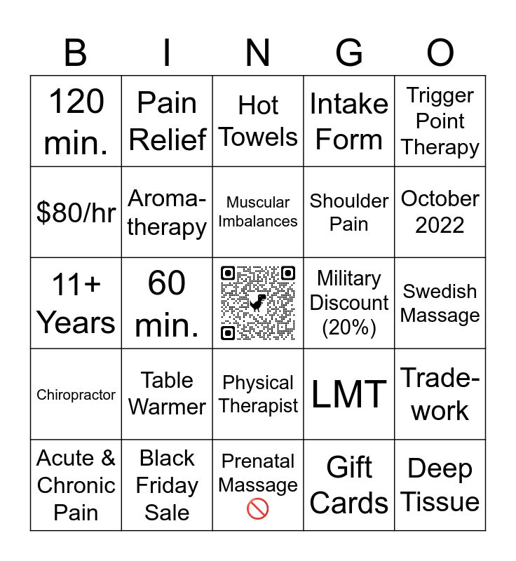 This bingo card has a free space and 29 words: Acute & Chronic Pain, Sciatica, 60 min., 90 min., 120 min., Hot Towels, Aroma-therapy, Table Warmer, Military Discount (20%), Black Friday Sale, Swedish Massage, Deep Tissue, Prenatal Massage 🚫, Gift Cards, October 2022, Personal Trainers, Physical Therapist, Chiropractor, Trigger Point Therapy, 11+ Years, LMT, Ideal Client, Shoulder Pain, $80/hr, Intake Form, Pain Relief, Trade-work, Muscular Imbalances and Low Back Pain.
