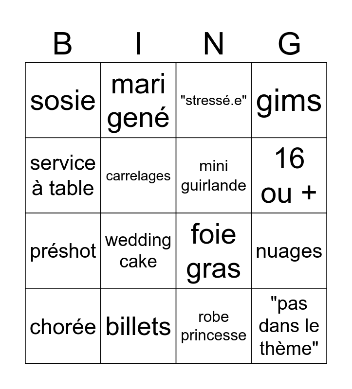 This bingo card has 16 words: billets, nuages, "stressé.e", sosie, préshot, mari gené, foie gras, robe princesse, service à table, carrelages, chorée, gims, wedding cake, 16 ou +, mini guirlande and "pas dans le thème".