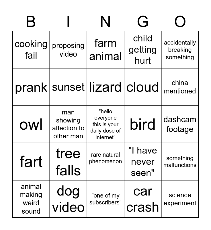 This bingo card has a free space and 59 words: police, dog video, cat video, fart, car crash, avalanche, sunset, weird lights in sky, cloud, funny / cool invention, child getting hurt, smart animal, prank, security cam, doorbell cam, cooking fail, science experiment, accidentally breaking something, baby, lizard, bird, farm animal, animal making weird sound, something malfunctions, squirrel, sports moment, person doing athletic thing with body (flexibility...), trickshot, china mentioned, "this is how...", "no one was hurt", video he recorded, animal falling, person falling, proposing video, birthday, lightning, man showing affection to other man, timelapse, owl, "I had no idea", tree falls, dashcam footage, good reflexes, "for some reason", egg inside an egg, "a few days ago", he went on a trip, rare natural phenomenon, "one of my subscribers", animal saves other animal, thief, veterinarian, musical instrument, Delivery guy, "I have never seen", Drone footage, someone falls and animal attacks human.