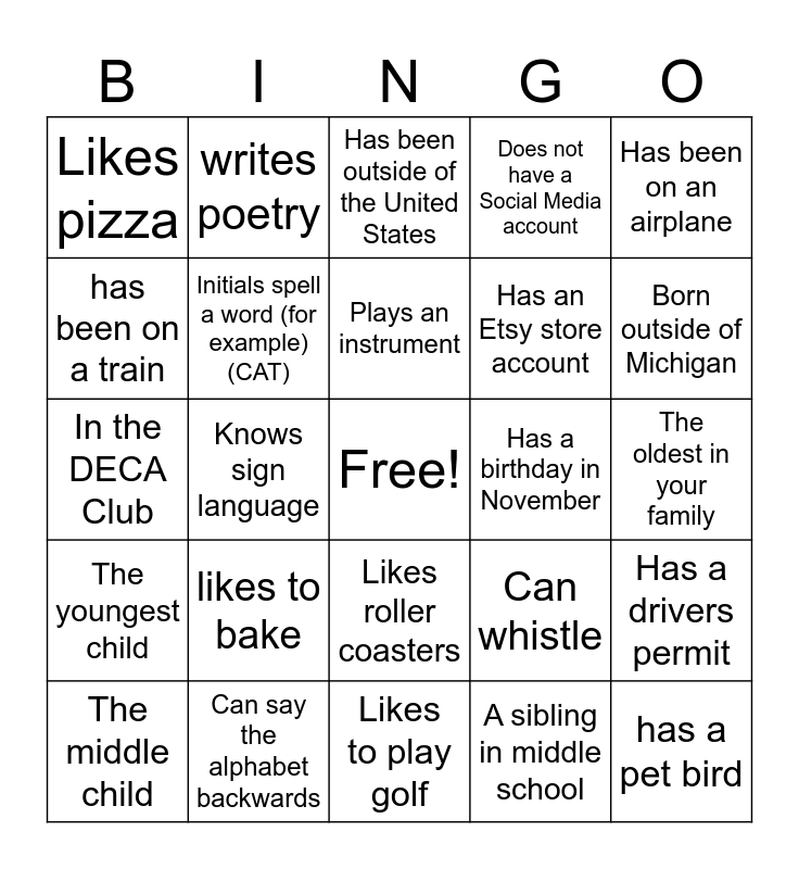 This bingo card has a free space and 24 words: likes to bake, Can say the alphabet backwards, Plays an instrument, The middle child, Has been on an airplane, Likes pizza, has been on a train, writes poetry, Has a birthday in November, Likes roller coasters, Has an Etsy store account, In the DECA Club, Can whistle, Has a drivers permit, Initials spell a word (for example) (CAT), A sibling in middle school, The oldest in your family, Has been outside of the United States, Born outside of Michigan, Knows sign language, has a pet bird, The youngest child, Does not have a Social Media account and Likes to play golf.