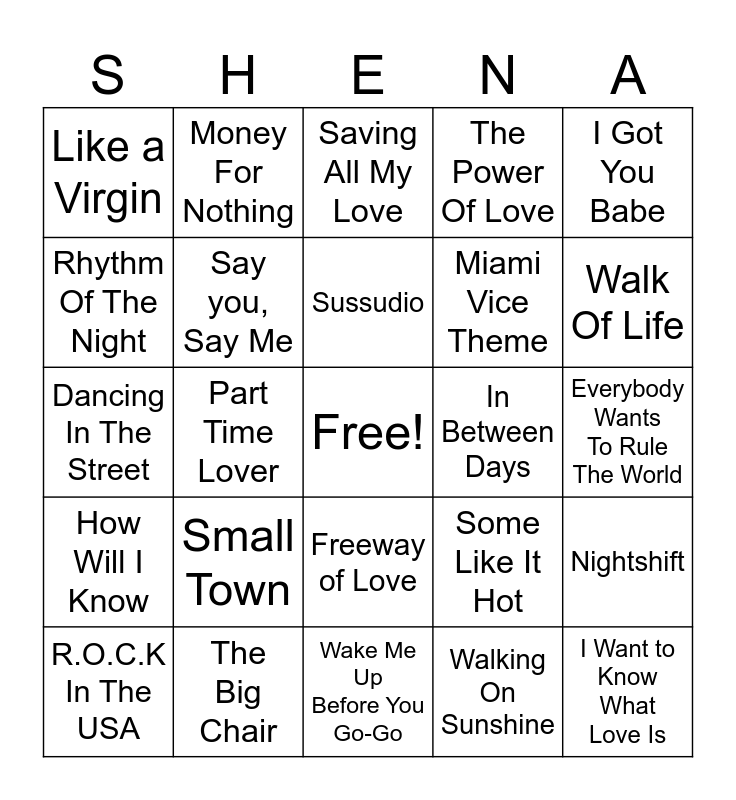 This bingo card has a free space and 33 words: We Built This City, Take On Me, Part Time Lover, Oh Sheila, How Will I Know, Say you, Say Me, I Got You Babe, R.O.C.K In The USA, Money For Nothing, Raspberry Beret, Sussudio, Saving All My Love, You Belong To The City, We Are The World, In Between Days, Walk Of Life, The Big Chair, Dancing In The Street, Small Town, Some Like It Hot, Freeway of Love, Careless Whisper, Like a Virgin, Everybody Wants To Rule The World, Wake Me Up Before You Go-Go, I Want to Know What Love Is, The Power Of Love, Miami Vice Theme, Rhythm Of The Night, Nightshift, The Boys Of Summer, Walking On Sunshine and Method of Modern Love.