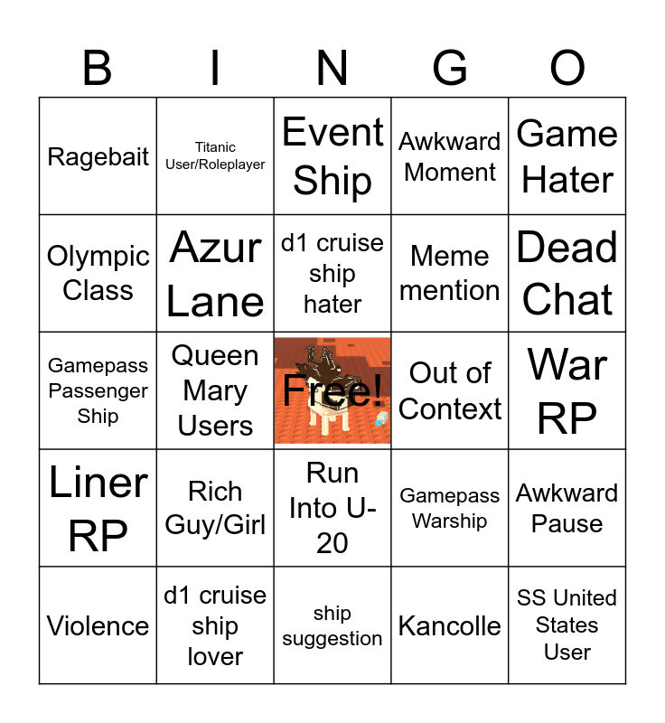 This bingo card has a free space and 24 words: Rich Guy/Girl, d1 cruise ship lover, d1 cruise ship hater, Violence, Game Hater, Ragebait, Olympic Class, Titanic User/Roleplayer, Out of Context, Run Into U-20, Meme mention, Gamepass Passenger Ship, Gamepass Warship, Awkward Pause, Azur Lane, Kancolle, War RP, Event Ship, Dead Chat, Queen Mary Users, SS United States User, Liner RP, Awkward Moment and ship suggestion.