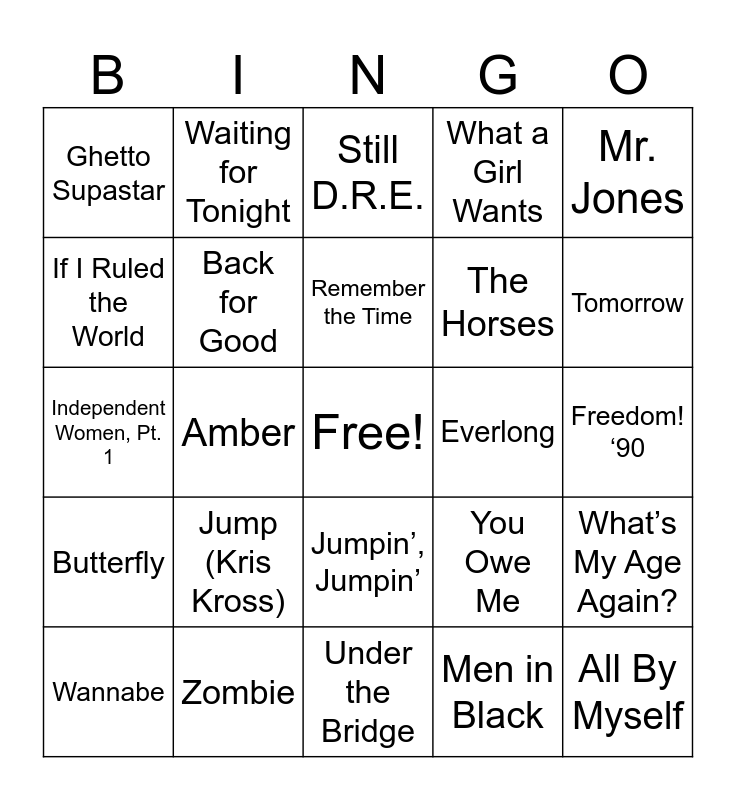 This bingo card has a free space and 112 words: No Scrubs, …Baby One More Time, Bye Bye Bye, I Want It That Way, Come On Over Baby (All I Want Is You), It’s Gonna Be Me, What a Girl Wants, Say My Name, Miami, Fantasy, Oops!… I Did It Again, Torn, Maria Maria, Waterfalls, My Own Worst Enemy, Smells Like Teen Spirit, Jumpin’, Jumpin’, (You Drive Me) Crazy, Mambo No. 5, Tearin’ Up My Heart, Wannabe, Still D.R.E., I Try, Always Be My Baby, Be My Lover, Butterfly, Zombie, Ex-Factor, Gangsta’s Paradise, There’s Your Trouble, Ghetto Supastar, Amber, Two Princes, Smooth Operator, All the Small Things, Smooth, If You Had My Love, Creep (TLC), Black or White, Genie in a Bottle, It Must Have Been Love, Bitter Sweet Symphony, Doo Wop (That Thing), Livin’ la Vida Loca, Everlong, Pony, Make Me Lose Control, Under the Bridge, My All, You Owe Me, Let’s Get Loud, Men in Black, Truly Madly Deeply, Because You Loved Me, Losing My Religion, So Anxious, Waiting for Tonight, November Rain, Creep (Radiohead), What’s My Age Again?, The Horses, Personal Jesus, Learn to Fly, Basket Case, She’s So High, It Wasn’t Me, Inside Out, Independent Women, Pt. 1, Kiss Me, Californication, All Star, Tomorrow, Ready or Not, Policy of Truth, The Most Beautiful Girl in the World, Jump (Kris Kross), My Heart Will Go On, Steal My Sunshine, Knockin’ on Heaven’s Door, Santeria, All By Myself, Fantasy (feat. O.D.B.), Remember the Time, Back for Good, Can I Kick It?, Drive, Thank You, Fade Into You, Never There, I Will Always Love You, Last Kiss, Mr. Jones, Would?, Even Flow, Insane in the Brain, Freedom! ‘90, Scar Tissue, Cherry Pie, Virtual Insanity, Meet Virginia, Hero, Man in the Box, Why I Love You So Much, Criminal, It’s Not Right But It’s Okay, Brother Louie Mix ‘98, If I Ruled the World, Hits From the Bong, Un-Break My Heart, I Have Nothing, Walking on Broken Glass and Lover, You Should’ve Come Over.