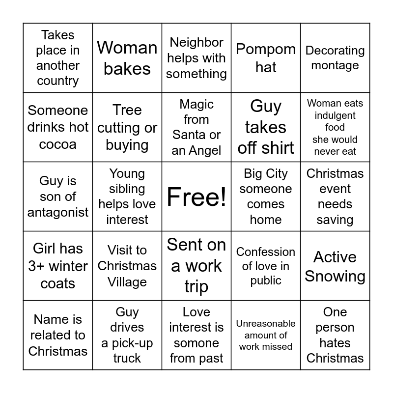 This bingo card has a free space and 24 words: Visit to Christmas Village, Guy drives a pick-up truck, Magic from Santa or an Angel, Name is related to Christmas, Decorating montage, Takes place in another country, Someone drinks hot cocoa, Woman bakes, Big City someone comes home, Sent on a work trip, Guy takes off shirt, Guy is son of antagonist, Confession of love in public, Active Snowing, Tree cutting or buying, Unreasonable amount of work missed, Christmas event needs saving, Neighbor helps with something, Woman eats indulgent food she would never eat, Young sibling helps love interest, One person hates Christmas, Girl has 3+ winter coats, Pompom hat and Love interest is somone from past.