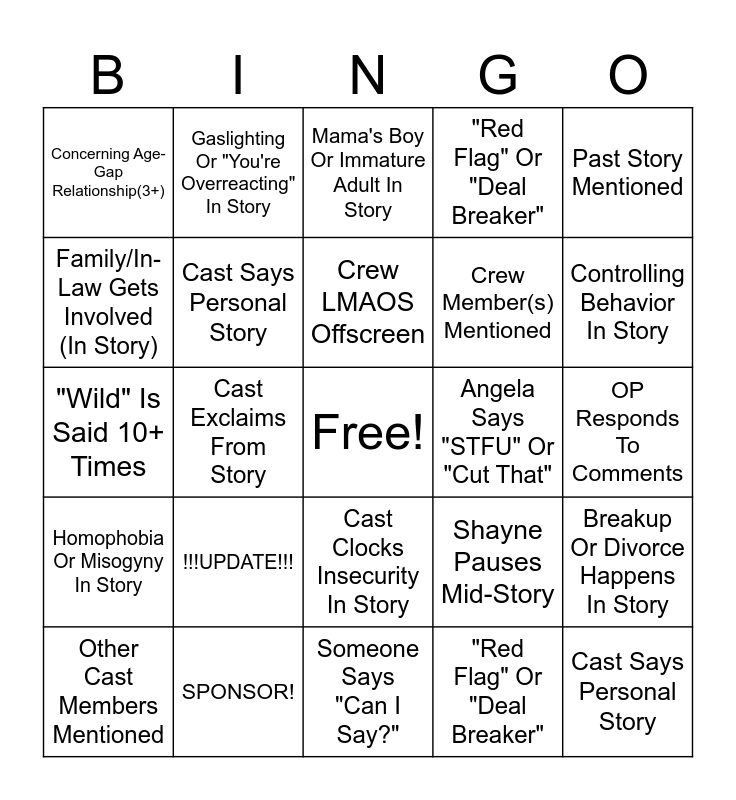 This bingo card has a free space and 24 words: !!!UPDATE!!!, SPONSOR!, Crew LMAOS Offscreen, Other Cast Members Mentioned, Past Story Mentioned, Concerning Age-Gap Relationship(3+), Family/In-Law Gets Involved (In Story), Gaslighting Or "You're Overreacting" In Story, Angela Says "STFU" Or "Cut That", Cast Clocks Insecurity In Story, Crew Member(s) Mentioned, "Wild" Is Said 10+ Times, Shayne Pauses Mid-Story, Breakup Or Divorce Happens In Story, Cast Says Personal Story, "Red Flag" Or "Deal Breaker", OP Responds To Comments, Mama's Boy Or Immature Adult In Story, Controlling Behavior In Story, Cast Exclaims From Story, Cast Says Personal Story, Homophobia Or Misogyny In Story, "Red Flag" Or "Deal Breaker" and Someone Says "Can I Say?".