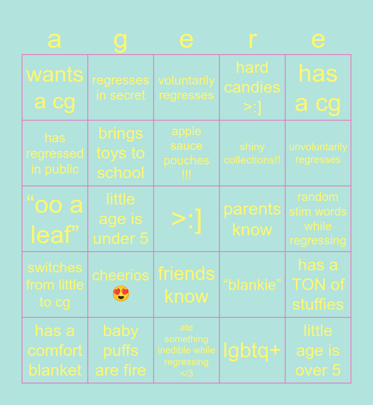 This bingo card has a free space and 24 words: cheerios 😍, baby puffs are fire, apple sauce pouches !!!, has a comfort blanket, has a cg, wants a cg, has regressed in public, regresses in secret, parents know, friends know, shiny collections!!, “oo a leaf”, “blankie”, has a TON of stuffies, brings toys to school, lgbtq+, random stim words while regressing, voluntarily regresses, unvoluntarily regresses, little age is under 5, little age is over 5, switches from little to cg, hard candies >:] and ate something inedible while regressing </3.