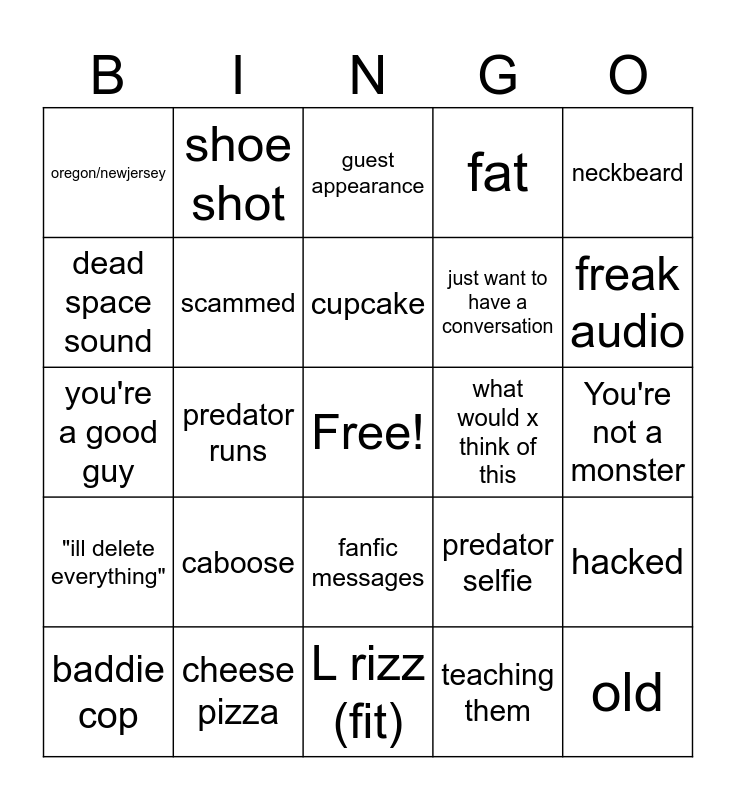 This bingo card has a free space and 24 words: caboose, cheese pizza, cupcake, baddie cop, neckbeard, oregon/newjersey, dead space sound, shoe shot, what would x think of this, fanfic messages, just want to have a conversation, you're a good guy, predator selfie, hacked, scammed, teaching them, You're not a monster, guest appearance, freak audio, predator runs, old, "ill delete everything", fat and L rizz (fit).
