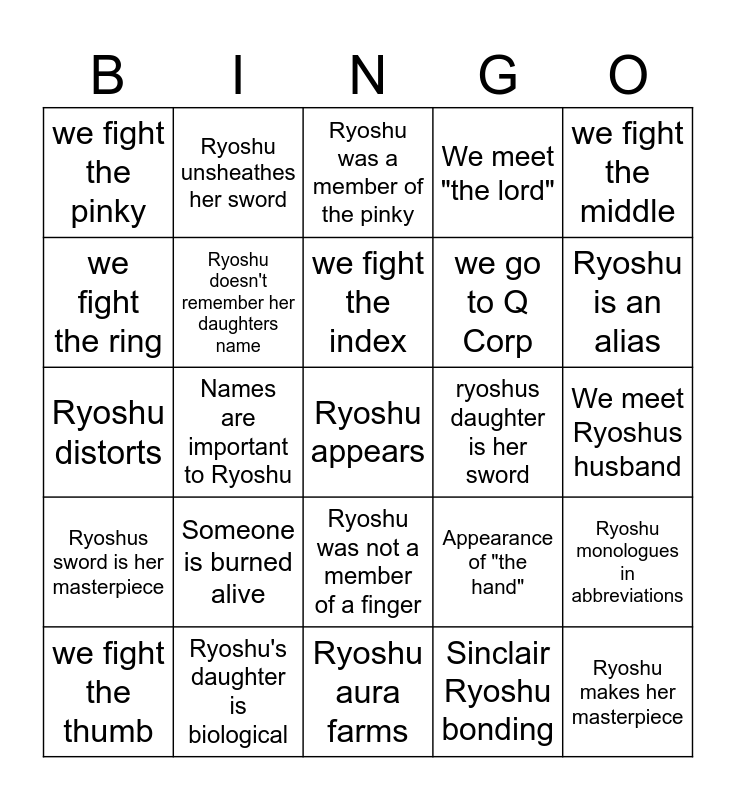 This bingo card has a free space and 24 words: Someone is burned alive, Ryoshu's daughter is biological, we fight the index, we fight the thumb, we fight the middle, we fight the pinky, we fight the ring, Ryoshu unsheathes her sword, ryoshus daughter is her sword, Ryoshu was not a member of a finger, we go to Q Corp, Ryoshu distorts, Appearance of "the hand", Ryoshu monologues in abbreviations, Ryoshu doesn't remember her daughters name, Sinclair Ryoshu bonding, We meet Ryoshus husband, Ryoshu was a member of the pinky, Ryoshu is an alias, Names are important to Ryoshu, Ryoshu makes her masterpiece, Ryoshus sword is her masterpiece, We meet "the lord" and Ryoshu aura farms.