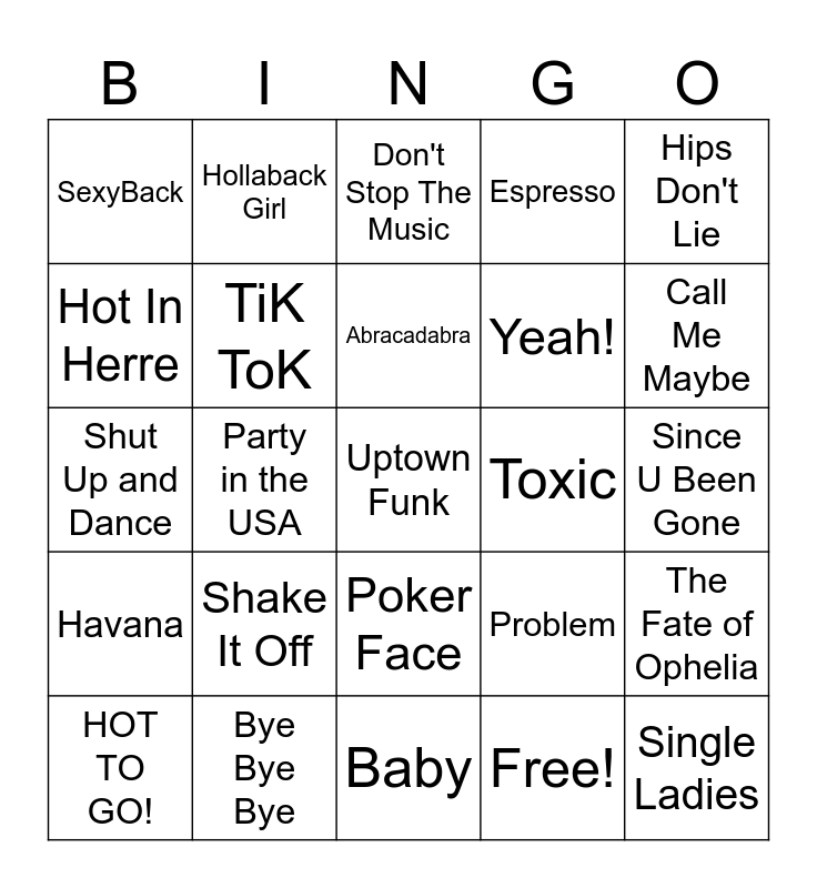 This bingo card has 30 words: Bye Bye Bye, Moves Like Jagger, Party in the USA, Teenage Dream, SexyBack, Don't Stop The Music, TiK ToK, Poker Face, Toxic, Baby, Since U Been Gone, Uptown Funk, Free!, Single Ladies, Call Me Maybe, What Makes You Beautiful, Problem, Havana, Shake It Off, Hips Don't Lie, Shut Up and Dance, Rolling in the Deep, Hollaback Girl, Yeah!, Hot In Herre, Espresso, The Fate of Ophelia, HOT TO GO!, Abracadabra and Die With A Smile.