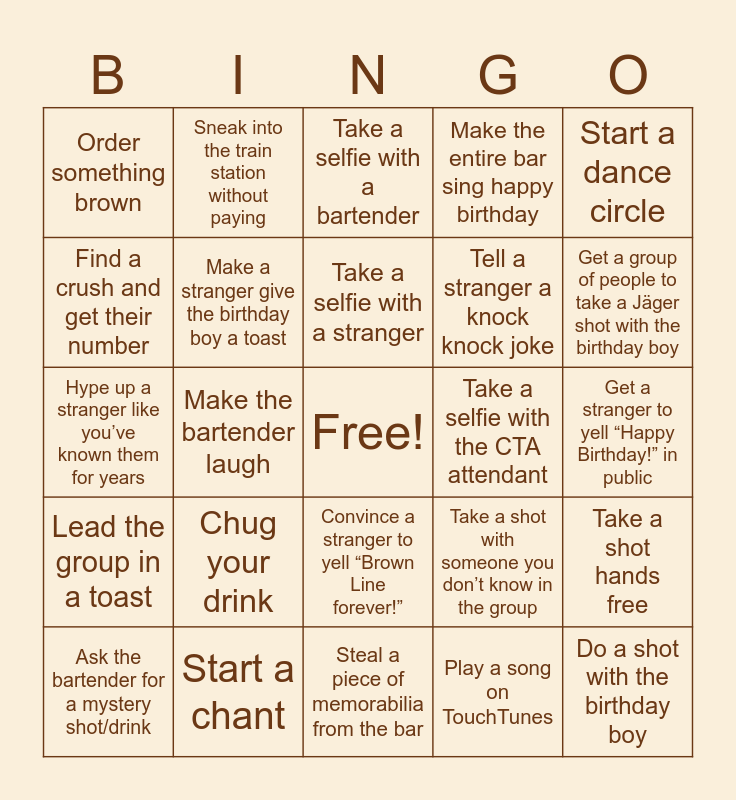 This bingo card has a free space and 24 words: Chug your drink, Start a chant, Take a selfie with a stranger, Ask the bartender for a mystery shot/drink, Start a dance circle, Order something brown, Find a crush and get their number, Sneak into the train station without paying, Take a selfie with the CTA attendant, Convince a stranger to yell “Brown Line forever!”, Tell a stranger a knock knock joke, Hype up a stranger like you’ve known them for years, Take a shot with someone you don’t know in the group, Take a shot hands free, Make a stranger give the birthday boy a toast, Play a song on TouchTunes, Get a stranger to yell “Happy Birthday!” in public, Take a selfie with a bartender, Get a group of people to take a Jäger shot with the birthday boy, Make the bartender laugh, Do a shot with the birthday boy, Lead the group in a toast, Make the entire bar sing happy birthday and Steal a piece of memorabilia from the bar.