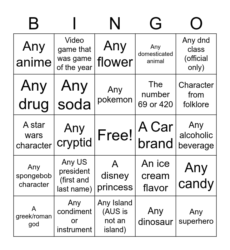 This bingo card has a free space and 25 words: Any US president (first and last name), Any Island (AUS is not an island), Any pokemon, A greek/roman god, Any dnd class (official only), Any anime, Any drug, Video game that was game of the year, A Car brand, A disney princess, The number 69 or 420, A star wars character, An ice cream flavor, Any candy, Any soda, Any mario character, Any alcoholic beverage, Any flower, Character from folklore, Any cryptid, Any superhero, Any condiment or instrument, Any spongebob character, Any domesticated animal and Any dinosaur.