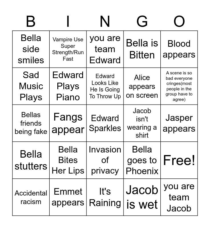 This bingo card has 47 words: Bella Touches Her Hair, Edward Sparkles, Someone Says Vampire, It's Raining, Bella Bites Her Lips, The Camera zooms in on their eyes, Vampire Use Super Strength/Run Fast, They Play Baseball, Sad Music Plays, Bella Almost Dies, Edward Plays Piano, Bella is Bitten, Free!, Bella goes to Phoenix, Bella and Edward Meet for the 1st Time, Jacob Shape Shifts, Edward Looks Like He Is Going To Throw Up, Jacob isn't wearing a shirt, Edward is about to throw up, Blood appears, Fangs appear, Jacob is wet, Bella side smiles, Alice appears on screen, Bella gets rescued, A scene is so bad everyone cringes(most people in the group have to agree), Accidental racism, A wolf appears on screen, Invasion of privacy, Bella stutters, Bella almost trips, Silent staring, Carlisle appears, Alice appears, Rosalie appears, Emmet appears, Jasper appears, Jasper does that weird stare, Hipster music plays, Vamp powers get used, you are team Jacob, you are team Edward, Bellas friends being fake, wilderness scene, Bella looks longingly off into the distance, Someone looks fine (most people in the group have to agree) and An outfit looks fugly (most people have to agree).