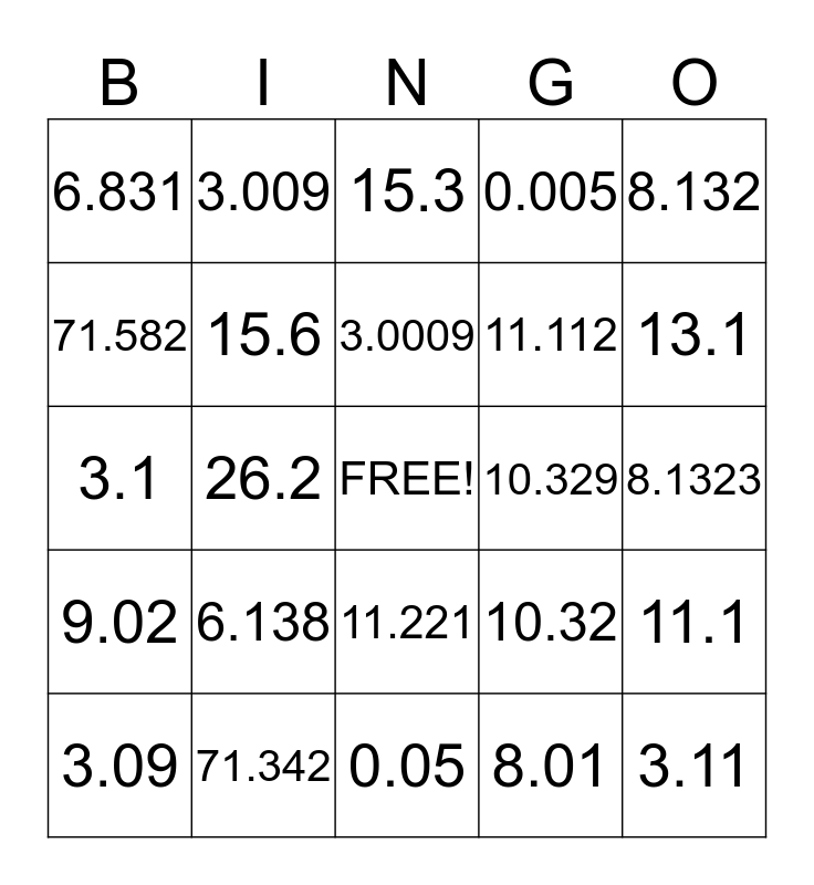This bingo card has a free space and 24 words: 6.138, 71.342, 3.0009, 3.09, 8.132, 6.831, 71.582, 3.009, 10.329, 11.221, 11.112, 3.1, 10.32, 11.1, 15.6, 8.01, 8.1323, 15.3, 13.1, 26.2, 3.11, 9.02, 0.005 and 0.05.