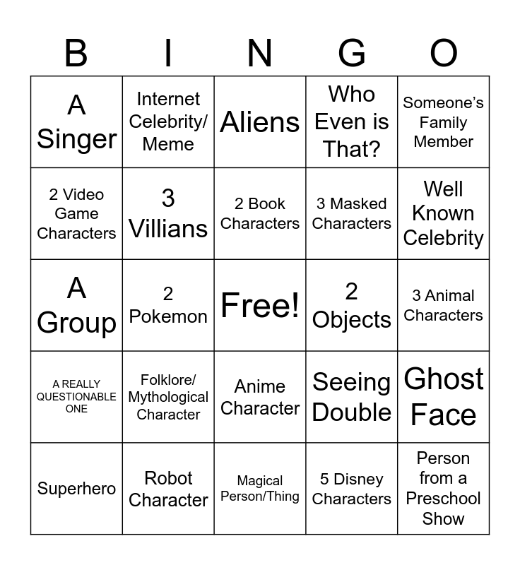 This bingo card has a free space and 24 words: Folklore/ Mythological Character, Robot Character, 2 Book Characters, Superhero, Someone’s Family Member, A Singer, 2 Video Game Characters, Internet Celebrity/ Meme, 2 Objects, Anime Character, 3 Masked Characters, A Group, Seeing Double, Ghost Face, 3 Villians, 5 Disney Characters, 3 Animal Characters, Aliens, Well Known Celebrity, 2 Pokemon, Person from a Preschool Show, A REALLY QUESTIONABLE ONE, Who Even is That? and Magical Person/Thing.