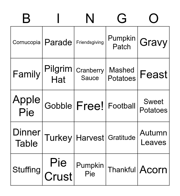 This bingo card has a free space and 25 words: Turkey, Pumpkin Pie, Cranberry Sauce, Stuffing, Gravy, Cornucopia, Family, Parade, Football, Harvest, Mashed Potatoes, Apple Pie, Gratitude, Autumn Leaves, Pilgrim Hat, Pumpkin Spice, Sweet Potatoes, Friendsgiving, Feast, Gobble, Acorn, Pie Crust, Dinner Table, Pumpkin Patch and Thankful.