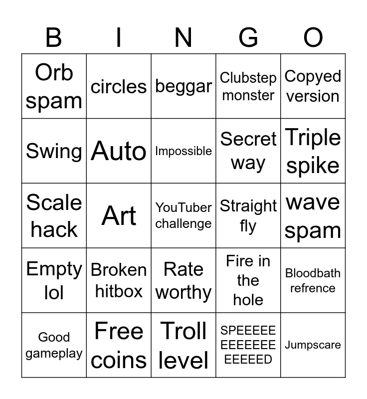 This bingo card has a free space and 24 words: Good gameplay, Broken hitbox, Impossible, SPEEEEE EEEEEEE EEEEED, Copyed version, Orb spam, circles, beggar, Straight fly, wave spam, Scale hack, Auto, Fire in the hole, Bloodbath refrence, Swing, Free coins, Troll level, Clubstep monster, Triple spike, Empty lol, Art, Rate worthy, Secret way and Jumpscare.